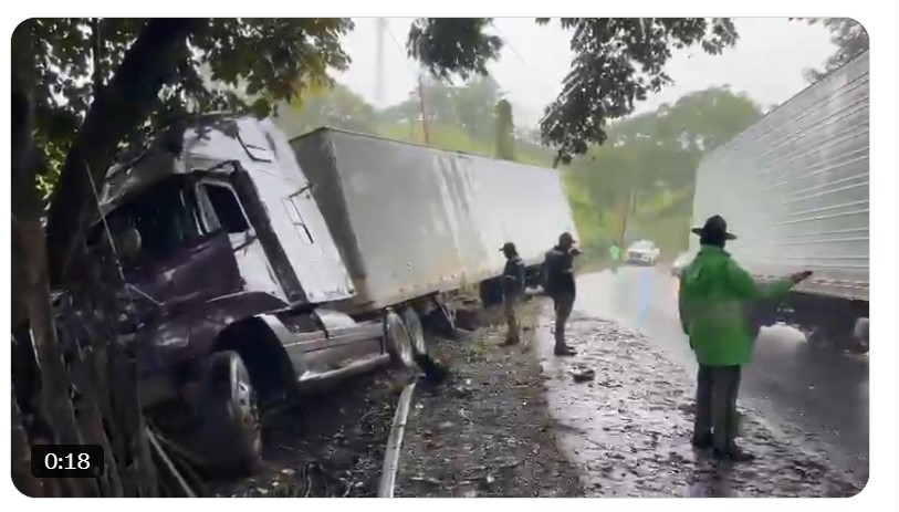 Un tráiler se salió de la vía en el kilómetro 284.5 de la ruta al Atlántico, en Morales, Izabal.