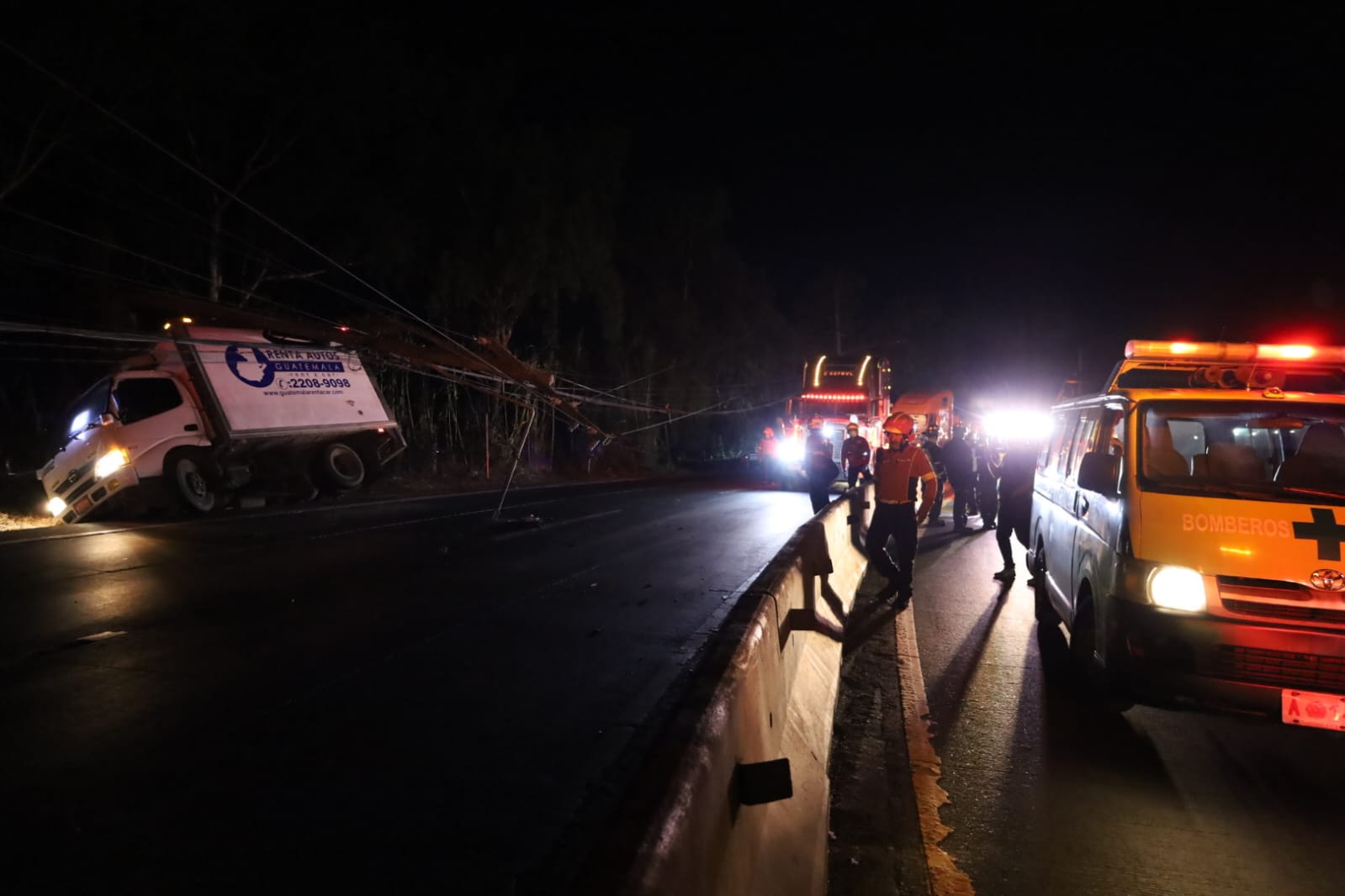 Camión colisiona con poste y bloquea paso en la bajada de Villalobos. (Foto: Prensa Libre, Bomberos Municipales).