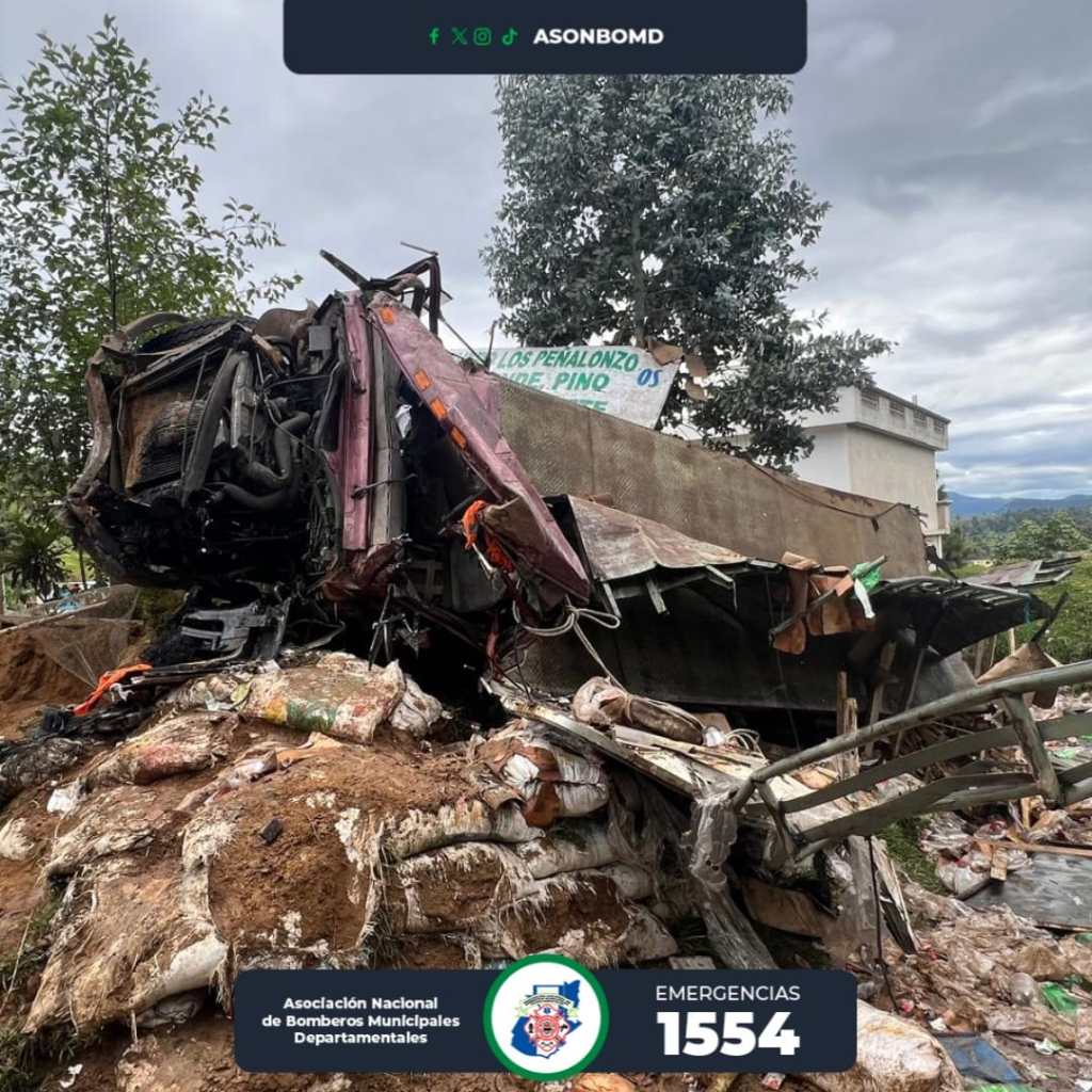 Los Bomberos Municipales Departamentales informan que el conductor del vehículo pesado y otros dos hombres fueron trasladados al Hospital Regional de San Marcos.