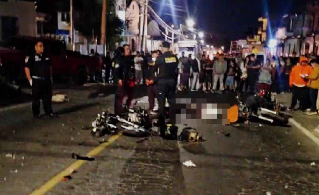 Una colisión de motocicletas deja un fallecido y un herido grave frente a la subestación de la PNC en Bárcena, Villa Nueva, lo que mantiene bloqueado el paso vehicular en el sector.