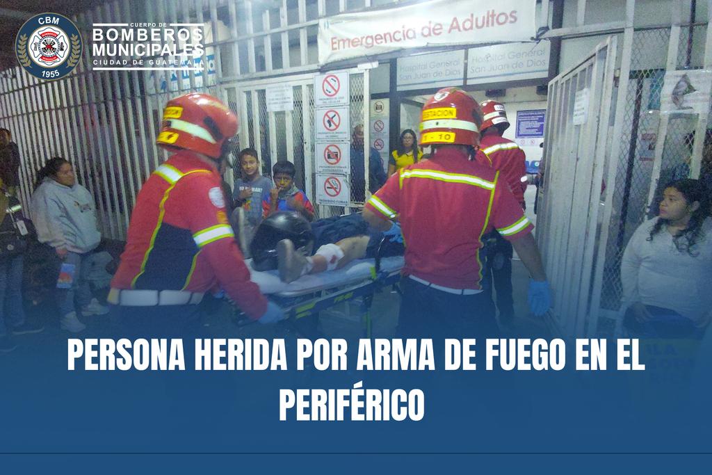 Un joven de 25 años es atacado a balazos en la entrada a la colonia Las Torres, Anillo Periférico, zona 7, y en estado delicado es trasladado por los Bomberos Municipales al Hospital General San Juan de Dios.