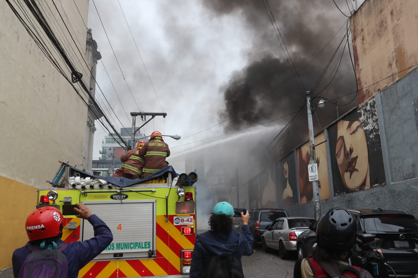 Socorristas combaten las llamas de varios vehículos dentro de un parqueo contiguo al Congreso, donde se registran disturbios.