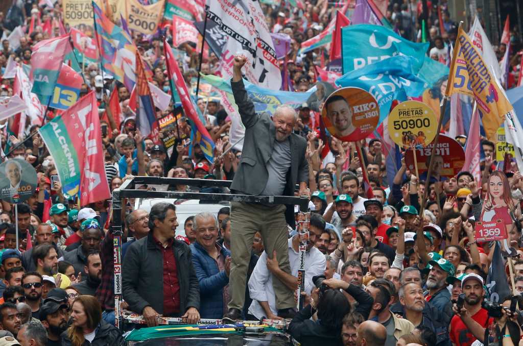 A unos 5 km, miles de votantes de Lula, de 76 años y al frente de los sondeos, lo recibieron en la emblemática avenida Paulista, escenario de las grandes manifestaciones en la megalópolis, para una “marcha de la victoria” en el último día de campaña.