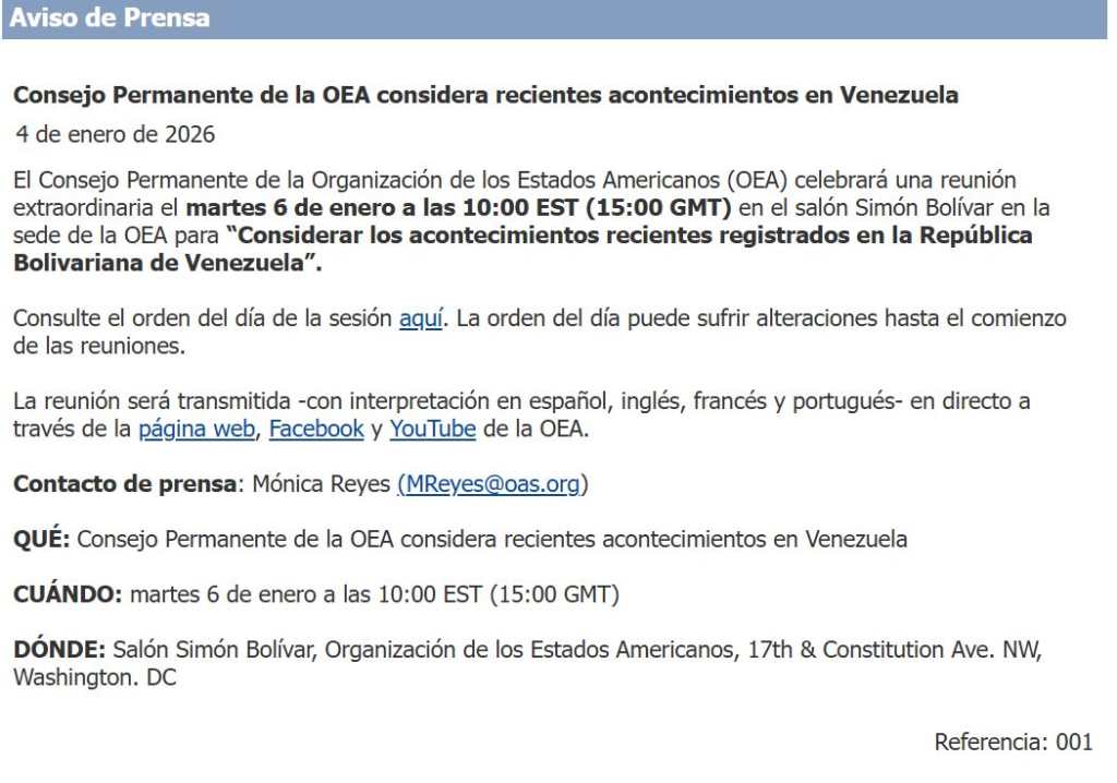 El Consejo Permanente de la Organización de los Estados Americanos (OEA) celebrará una reunión extraordinaria el martes 6 de enero a las 10:00 EST (15:00 GMT) en el salón Simón Bolívar, sede de la OEA en Washington, para considerar los recientes acontecimientos en Venezuela.