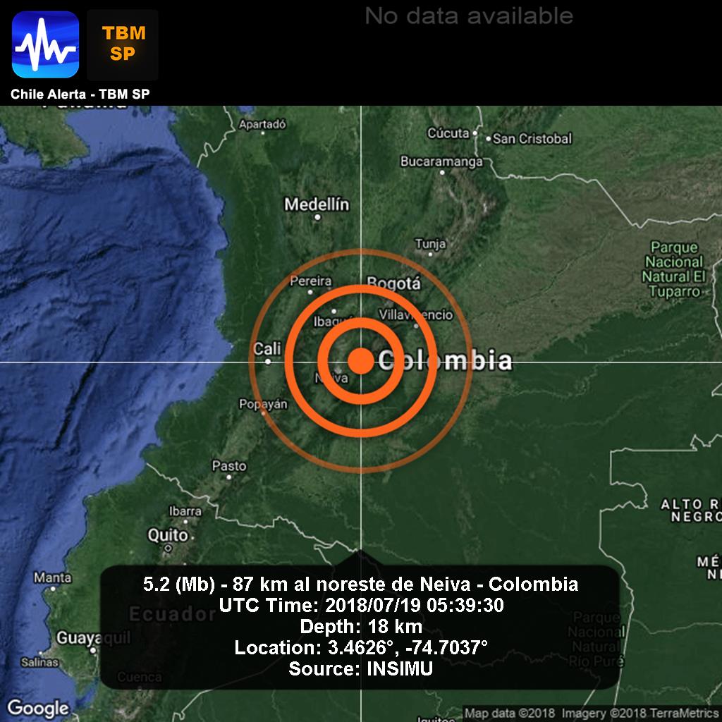 Un sismo de 5,2 grados de magnitud sacudió esta madrugada el centro de Colombia sin que hasta el momento las autoridades hayan informado de víctimas o daños materiales, informó el Servicio Geológico Colombiano (SGC). El movimiento tuvo su epicentro a 11 kilómetros del municipio de Colombia, en el departamento del Huila, a las 00.39 hora local de este jueves (05.39 GMT), añadió el SGC.