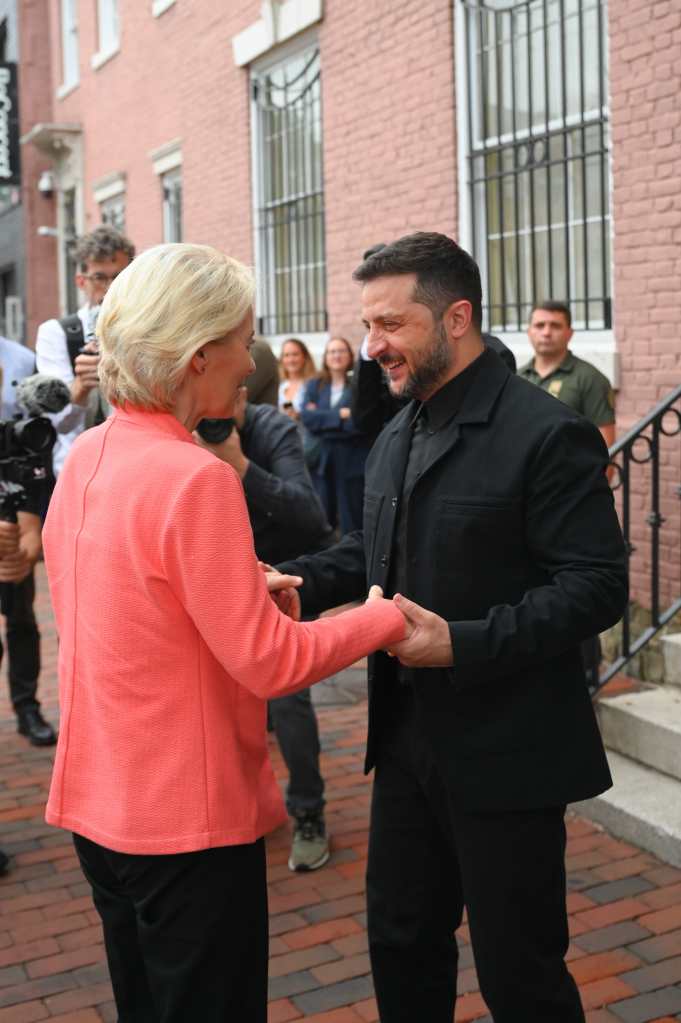El presidente ucraniano, Volodimir Zelenski, viste camisa y chaqueta negras, en contraste con su tradicional indumentaria de estilo militar.