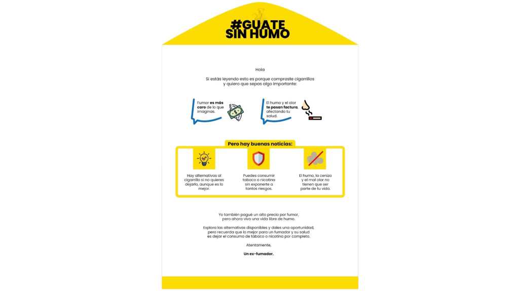 La iniciativa "Guate Sin Humo" ya demostró ser efectiva en 2023, cuando se suspendió la venta de cigarrillos durante un día en los principales comercios del país. Este año, la campaña da un paso más allá, al ocultar los precios y destacar el mensaje "Fumar es más caro de lo que imaginas", además de entregar a los fumadores adultos que visiten los puntos de venta, una carta escrita por un ex fumador, en la que comparte su experiencia personal sobre los costos ocultos del tabaquismo.