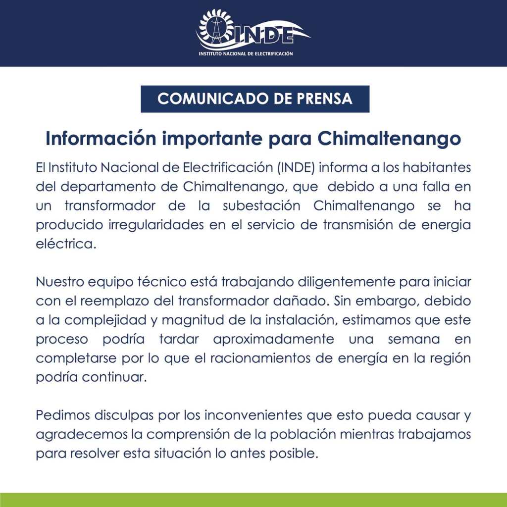Mientras que el distribuidor publicó un comunicado en el que informó que “el servicio eléctrico continuará irregular en municipios de Chimaltenango, como consecuencia de la indisponibilidad de uno de los transformadores de la subestación Chimaltenango, propiedad del Instituto Nacional de Electrificación (INDE)”.