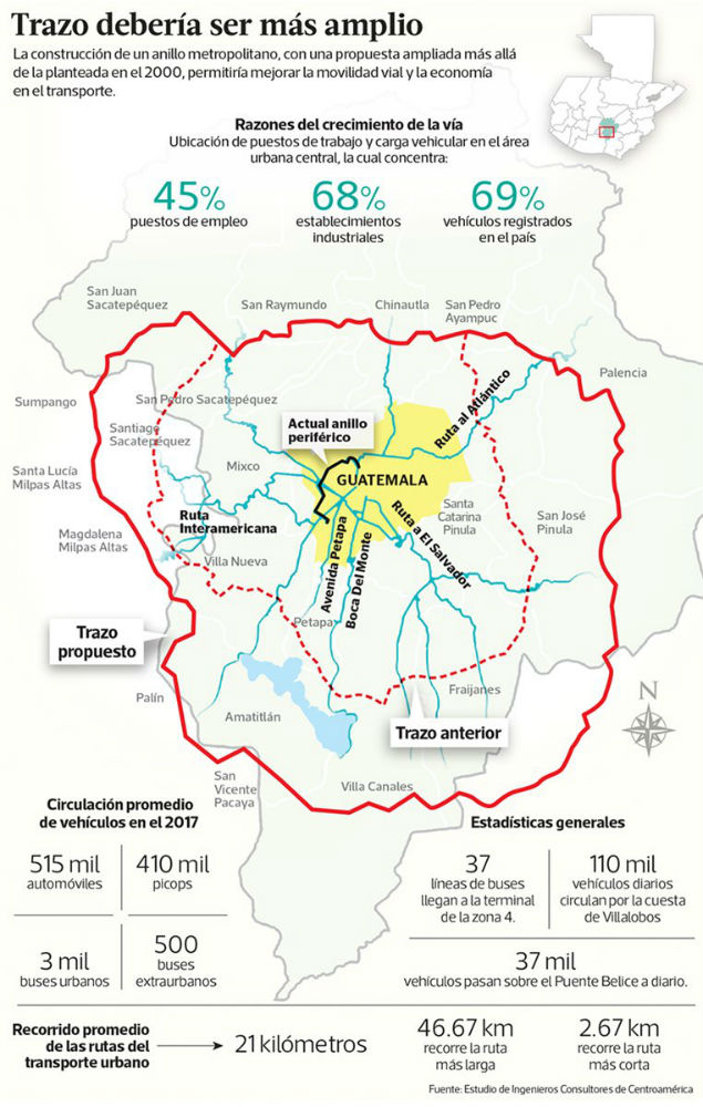 “Debe ser tomado como proyecto de nación. Dada la envergadura del proyecto se requiere de dos períodos de Gobierno”, expuso. En el año 2000 el anillo metropolitano estaba valorado en US$288 millones —al cambio actual Q2 mil 114 millones—, con inversión pública y privada.