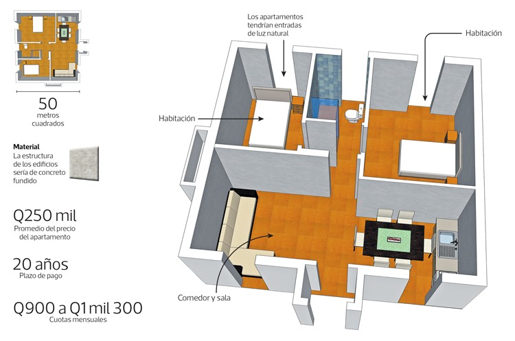 Los apartamentos tendrían un costo de Q250 mil, y las familias beneficiadas pagarían cuotas de entre Q900 y Q1  mil 300 hasta por 20 años.