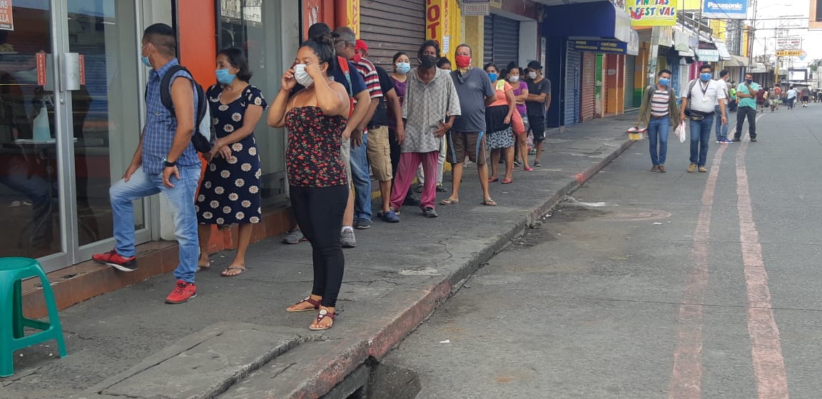 Vecinos en Escuintla hacen fila para ingresar a comprar alimentos en una abarrotería. (Foto Prensa Libre: Carlos Paredes)