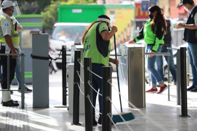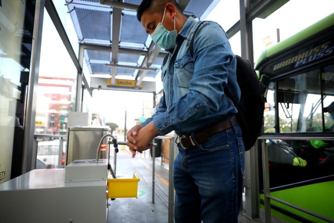 Los usuarios deben usar alcohol en gel para ingresar a las estaciones del Transmetro. (Foto Prensa Libre: Carlos Hernández).