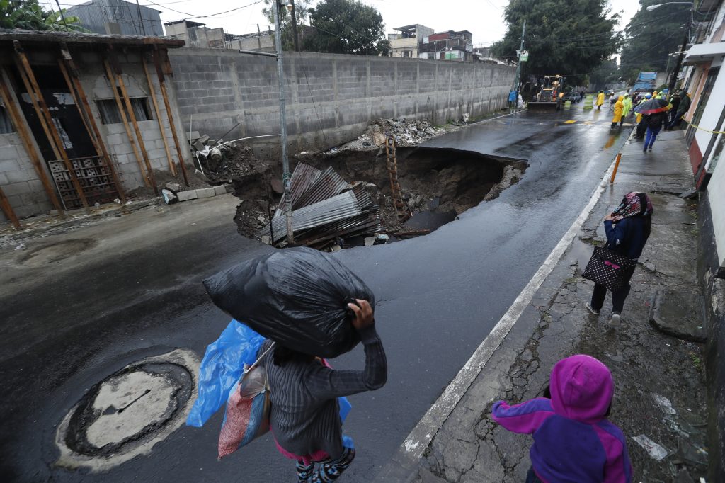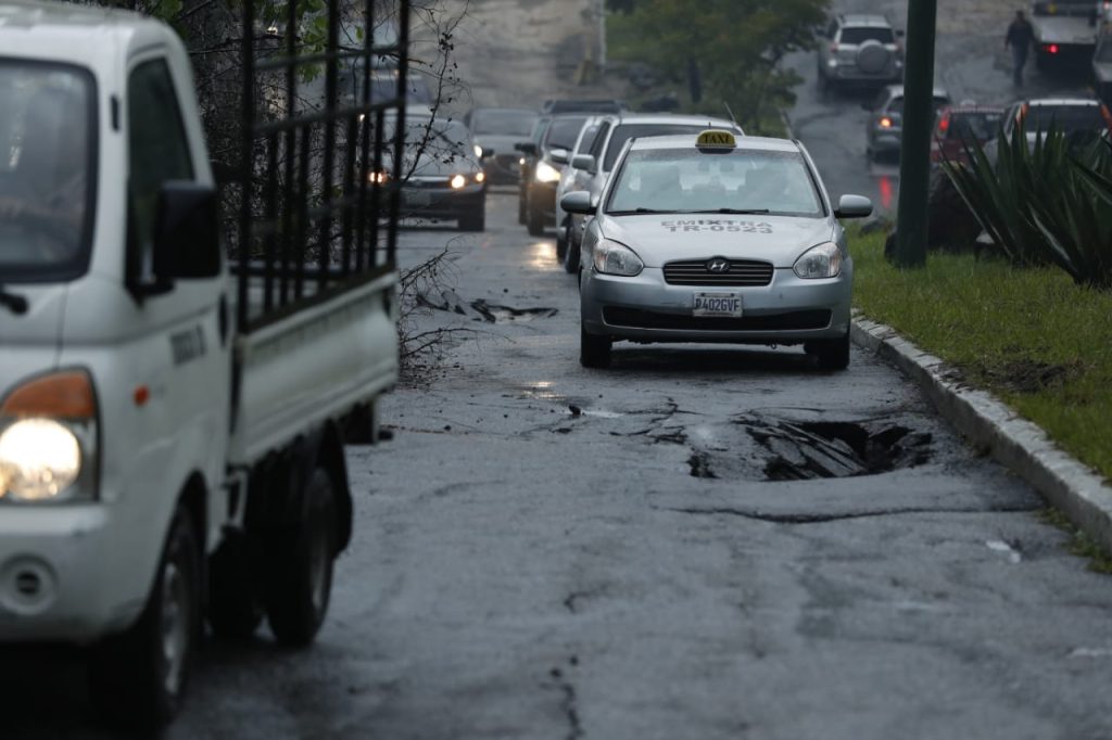 Este hundimiento se registro en la avenida Pablo VI por lo que el área se encuentra totalmente cerrada. Fotografía Prensa Libre: Esbin García