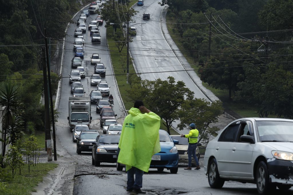 Lluvia provoca trafico vehicular por hundimiento de la carretera en el bulevar Tulam Tzu. Fotografía Prensa Libre: Esbin García