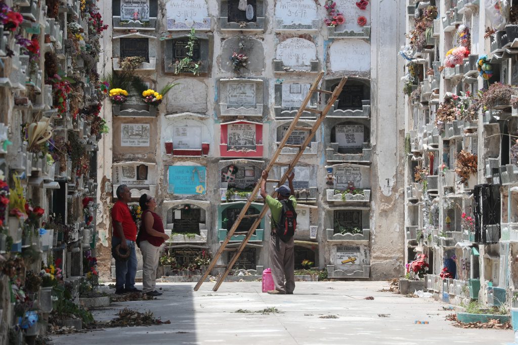 Luis Felipe Vasquez y Jessica Vasquez colocan flores para adornar la última morada de su madre.Vendedoras ofrecen flores a los visitantes del Cementerio General.
