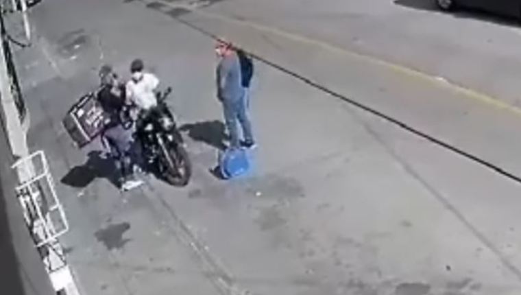 Uno de los delincuentes no logra sujetar bien la motocicleta y esta cae al asfalto, mientras que la víctima huye y uno de los delincuentes la persigue unos metros.