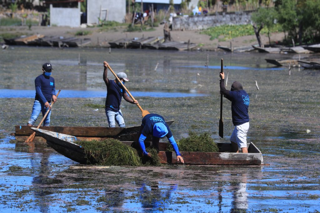 Una vez a la semana, voluntarios y vecinos de los alrededores de la cuenca retiran las algas en descomposición y dejan las nuevas o sanas, que ayudan a mitigar los desechos. También clasifican algas para que el Lago de Atitlán no se contamine por completo.