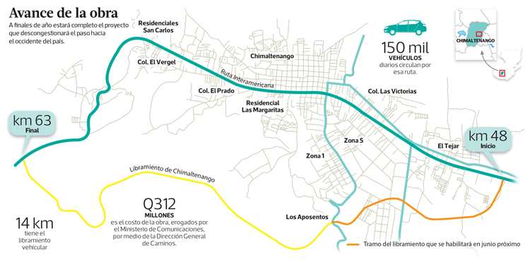 El proyecto libramiento Chimaltenango se construye para evitar el paso por esa ciudad y El Tejar, ya que debido a los miles de automovilistas que pasan por el lugar se forman largas filas y para recorrer unos 10 kilómetros se tardan al menos una hora.