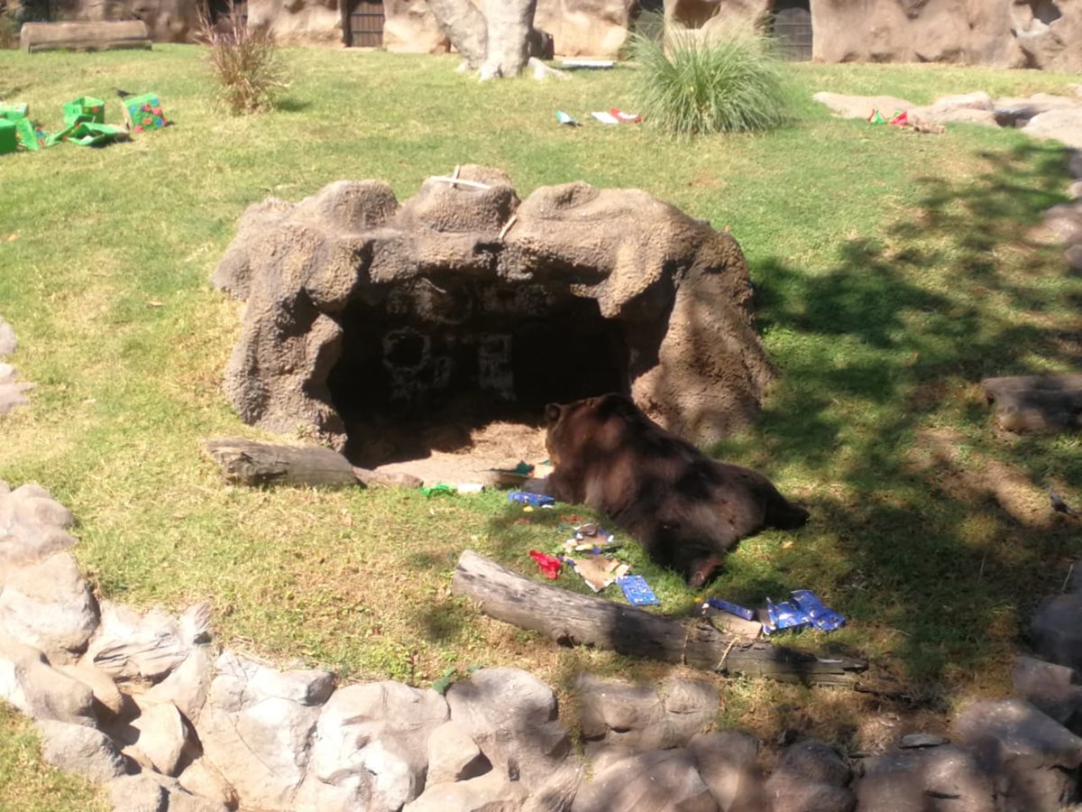 En el recinto del jaguar se colocó un regalo grande, pero este prefirió mantener su descanso, alejado de la afluencia masiva de personas que lo observaban.