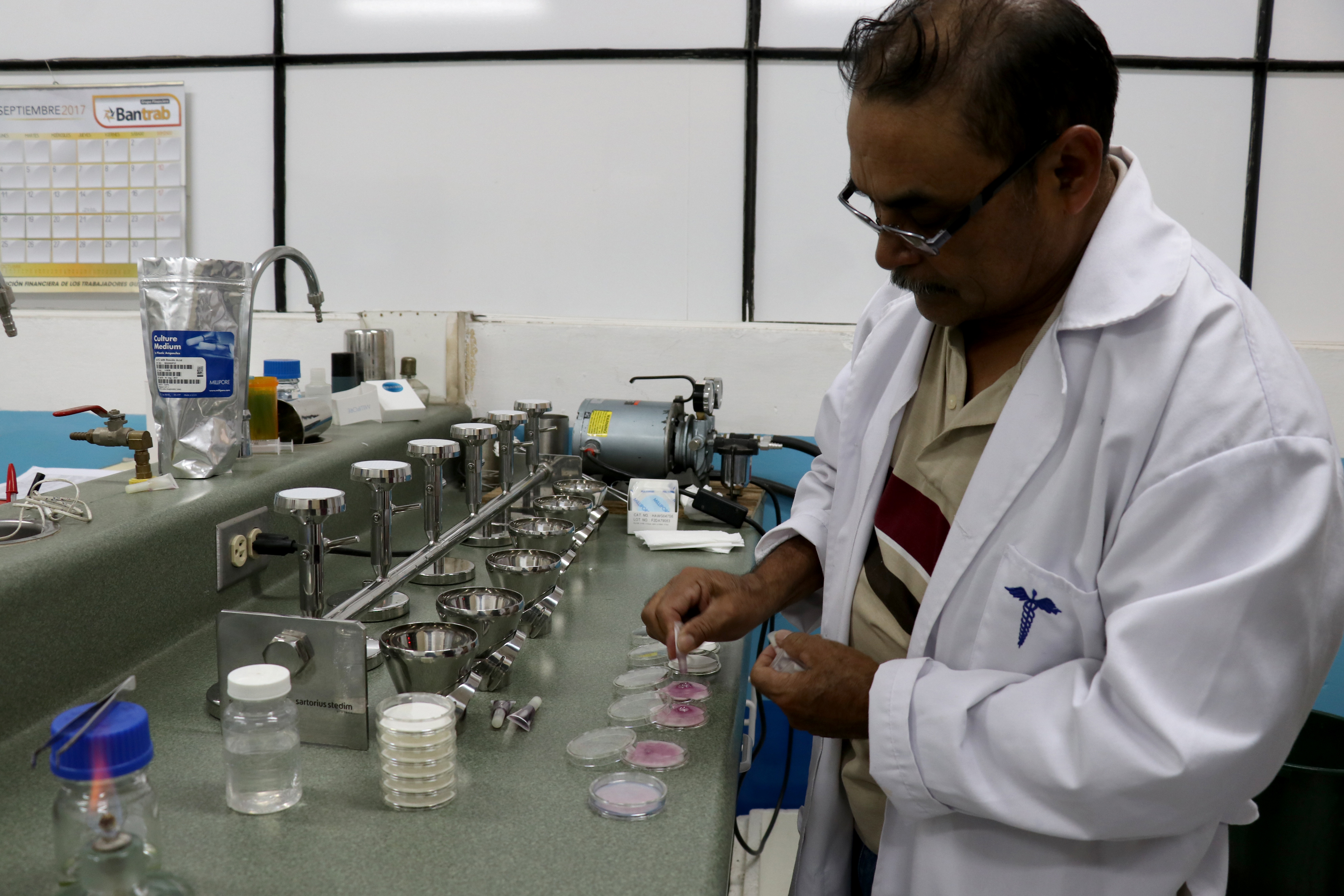 Un técnico del Ministerio de Salud analiza muestras de las distintas fuentes de agua que abastecen la cabecera departamental. fecales. (Foto Prensa Libre: Mike Castillo)