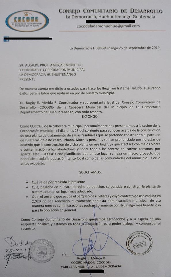 El Consejo Comunitario de Desarrollo (Cocode) de la cabecera municipal ante la falta de información por parte de la comuna acudió al Concejo el lunes 23 de septiembre y exigió les explicarán en qué consiste el proyecto.
