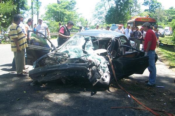 Este era el vehículo donde se desplazaban las mujeres y que fue chocado por un bus. (Foto Prensa Libre: Edwin Perdomo)