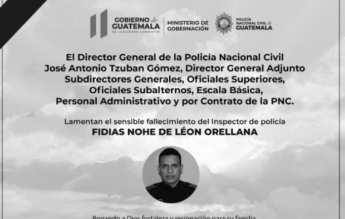 Lamentamos el deceso de nuestro Inspector de PNC Fidias Nohe de León Orellana, investigador de DIPANDA quién falleció en cumplimiento del deber en un operativo antiextorsiones en Izabal, donde hay un presunto extorsionista capturado y otro fallecido.#ProtegerYServir pic.twitter.com/i3XFS8yJXx