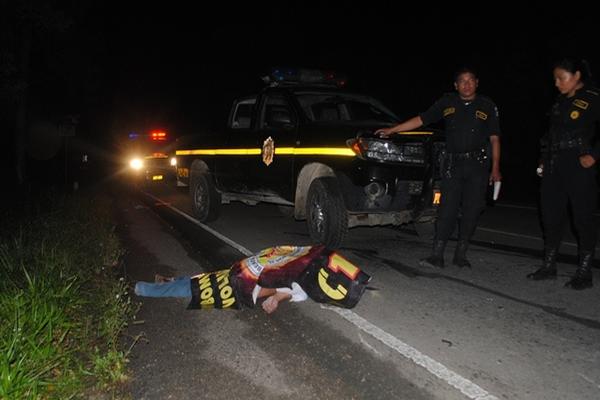 El cadáver del hombre sin identificar quedó tendido a la orilla de la carretera, en Poptún. (Foto Prensa Libre: Rigoberto Escobar)