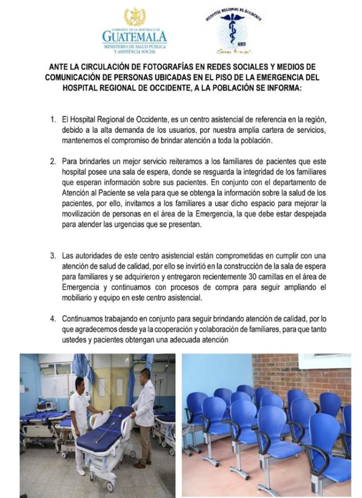 En un comunicado el HRO informó que adquirieron 30 camillas para el área de emergencia. Prensa Libre verificó en Guatecompras si de enero a la fecha existió alguna compra de camillas, pero no aparece en ese portal alguna compra de ese equipo.