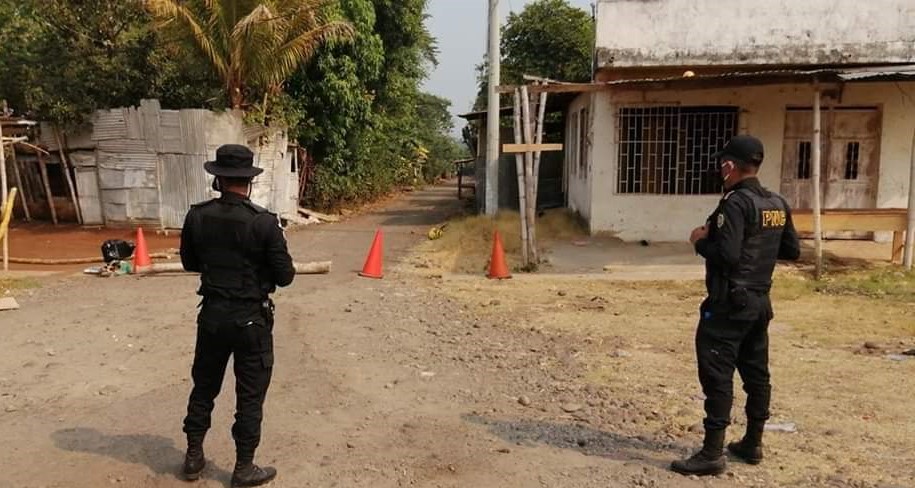 Agentes de la Policía Nacional Civil (PNC) resguardan las entradas y salidas del lugar para evitar el ingreso de personas ajenas a la comunidad.