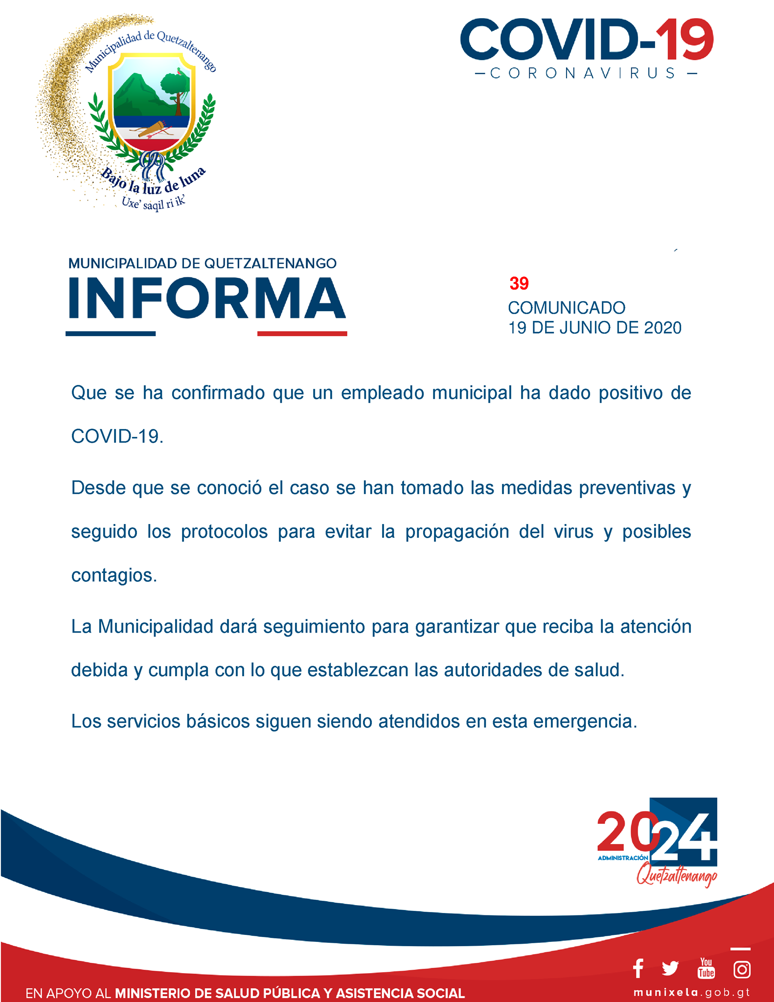 Guillermo Ramírez, concejal sexto, informó que por la sintomatología del trabajador fue enviado al Instituto Guatemalteco de Seguridad Social donde se le hizo la prueba y salió positivo.