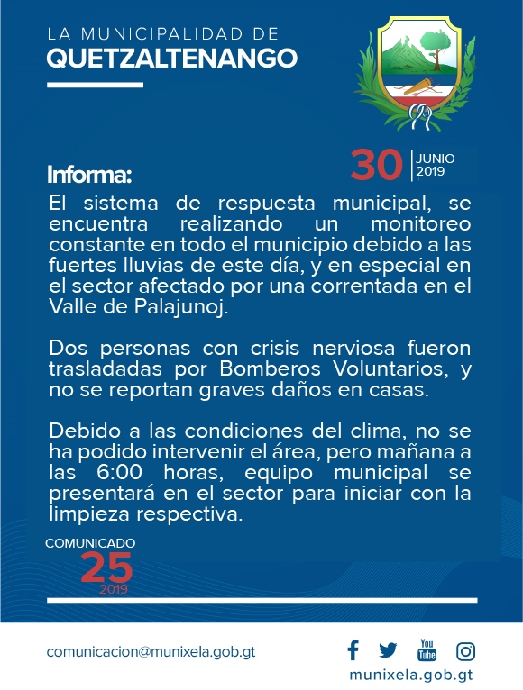 Al área no llegó ningún representante de la Coordinadora Nacional para la Reducción de Desastres (Conred) ni de la Municipalidad de Quetzaltenango, en ambos casos se intentó contactar vía telefónica a los responsables, pero no atendieron los teléfonos celulares.