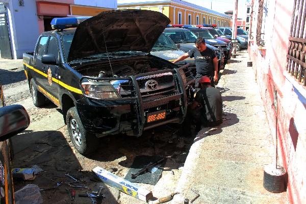 Agentes de la PNC señalaron que las reparaciones la hacen en la calle porque en la sede no hay espacio.