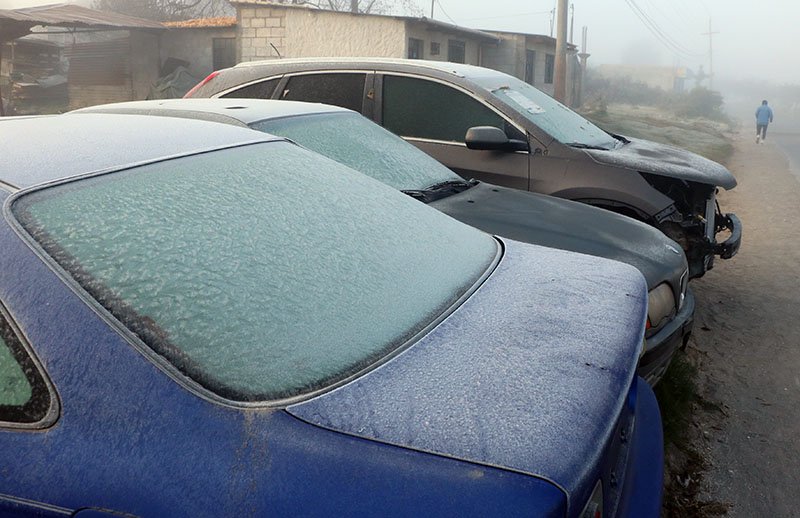Damián Mazariegos, vecino de Xela, explicó que el frío empezó a sentirse fuerte desde las 18 horas del lunes, y al levantarse la mañana de este martes notó una capa de escarcha sobre techos de láminas de viviendas, vehículos y campos.