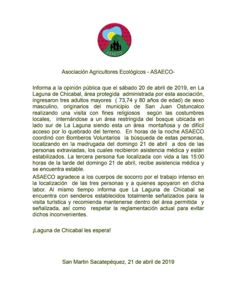 Doroteo Díaz, pastor de la Iglesia Presbiteriana Dios Viviente, comentó que los tres hermanos formaban parte de un grupo de personas que llegó a Chicabal para participar en un culto religiosos, pero en el descenso hacia la laguna estos se extraviaron, por lo que a las 18 horas dieron aviso a los cuerpos de socorro.