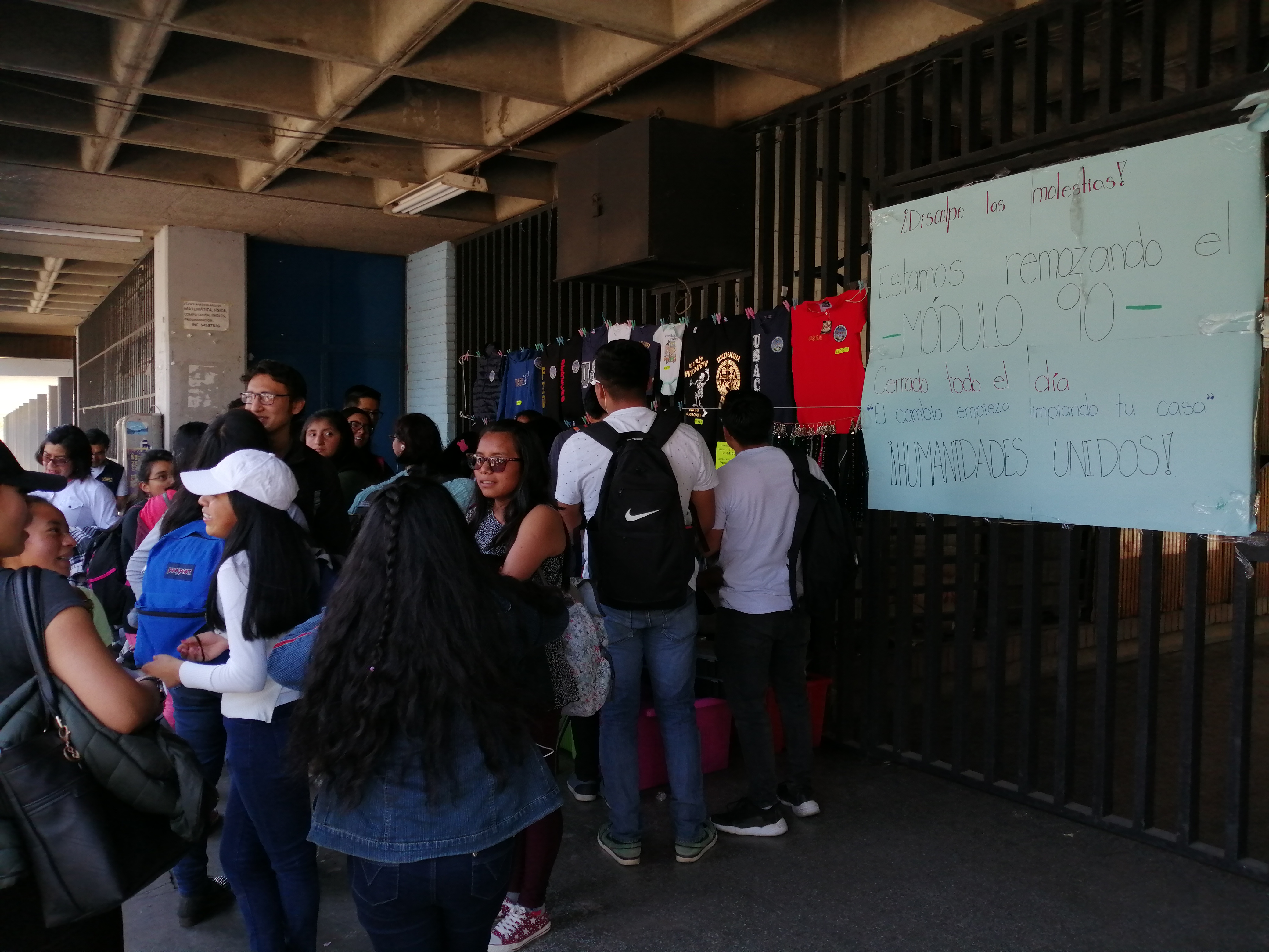 En uno de los ingresos al edifico colocaron un cartel con el mensaje “disculpe las molestias, estamos remozando el modulo 90, cerrado todo el día, el cambio empieza limpiando tu casa, humanidades unidos.q