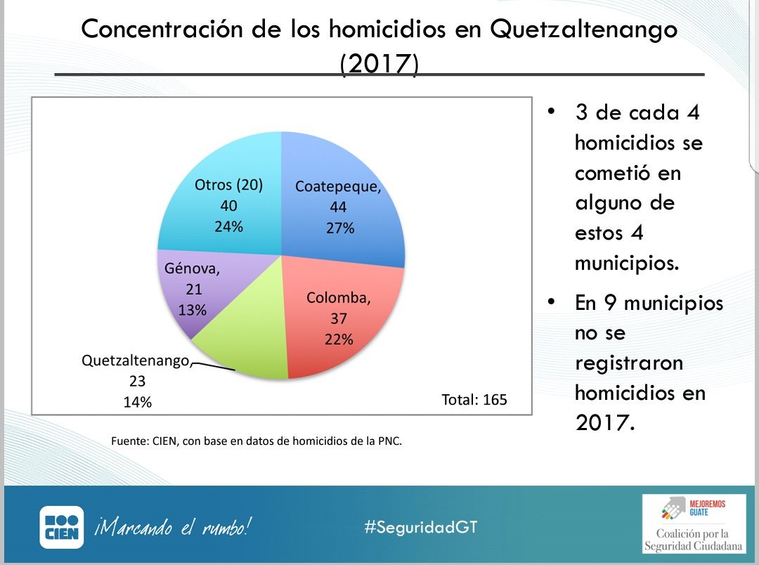En el 2017, la cifra anual de muertos en Quetzaltenango fue de 165. Los municipios con más violencia fueron. Coatepeque, con 44 muertos; Colomba, 37; Génova, 21 y la cabecera departamental, 23.