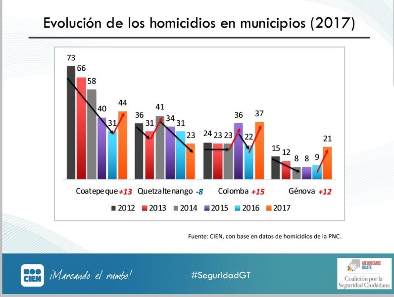 De acuerdo con Menchú, en total, son nueve los municipios donde la cantidad de homicidios subió este año, pero cinco destacan por las cifras rojas. Colomba, encabeza la lista con 23 muertos, Génova, 13; Quetzaltenango, 12; San Martín Sacatepéquez, 8 y El Palmar, 5.