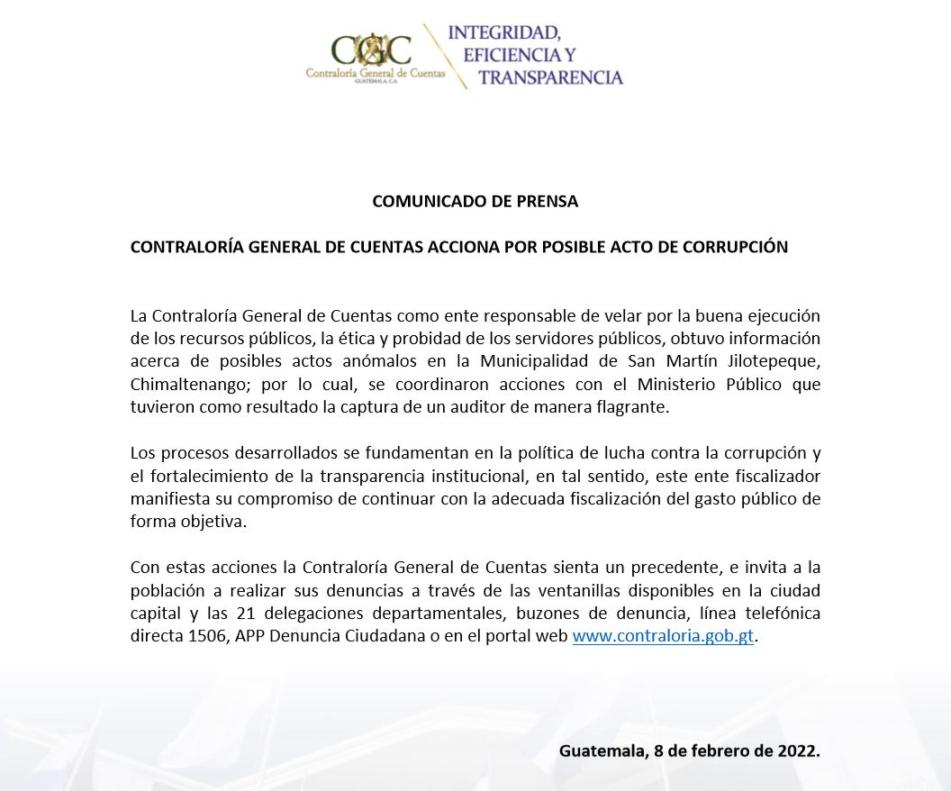 Por medio de un comunicado, la CGC informó que como ente responsable de velar por la buena ejecución de los recursos públicos, la ética y probidad de los servidores públicos, obtuvo información acerca de posibles actos anómalos en la Municipalidad de San Martín Jilotepeque, Chimaltenango; por lo cual, se coordinaron acciones con el Ministerio Público que tuvieron como resultado la captura de un auditor de manera flagrante.