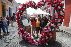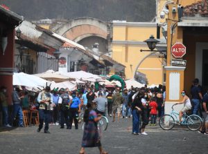 Decenas de personas han acudido a la ciudad colonial como parte de la celebración del Día del Cariño. Con mascarillas, pero sin respetar el distanciamiento, las personas caminan por las calles empedradas. Antigua Guatemala se encuentra en color naranja en el semáforo epidemiológico de alerta por coronavirus.