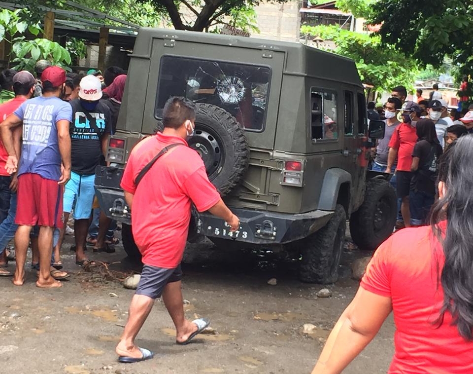 Pobladores, comerciantes e incluso balseros manifestaron su molestia y arremetieron en contra de miembros del ejercito y lanzaron piedras a uno de dos vehículos blindados J8 en los cuales se trasladaban los militares. Los agentes de la PNC lanzaron gas pimienta para dispersar a los inconformes.