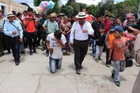Uno de los sentenciados recibe 20 azotes por su padre, frente a la Municipalidad de Sololá. (Foto Prensa Libre: Ángel Julajuj)