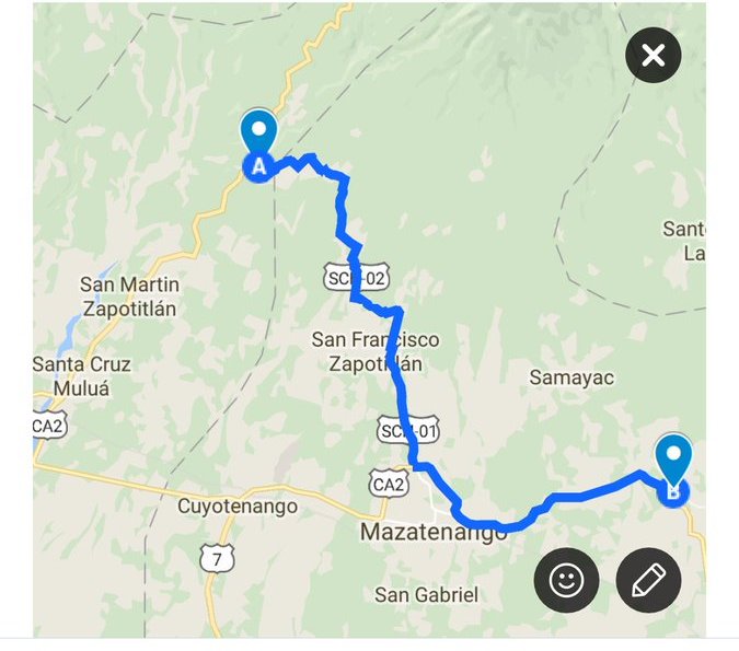 La primera ruta habilitada que es de terracería es unicamente para vehículos livianos y comienza en el kilómetro 159.5, en San Francisco Zapotitlán, Retalhuleu, pasa por Pueblo Nuevo y llega al Nuevo Palmar, Quetzaltenango, en el kilómetro 195.