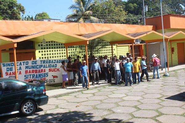 Empleados sindicalizados tomaron esta mañana las instalaciones de la municipalidad de Santa Bárbara, Suchitepéquez, para protestar retrasos en sus prestaciones salariales.