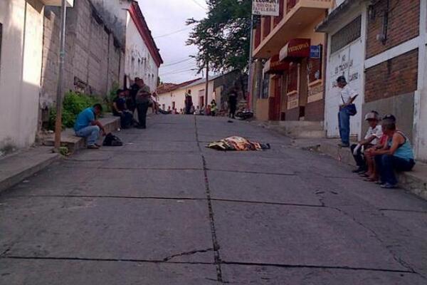 El cadáver de Itiel Méndez quedó tendido en una de las calles del barrio La Laguna. (Foto Prensa Libre: Érick de la Cruz).