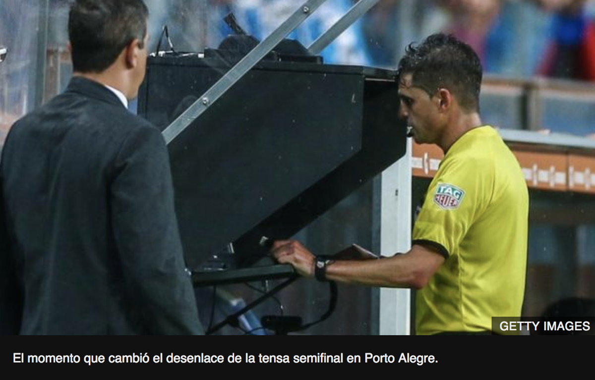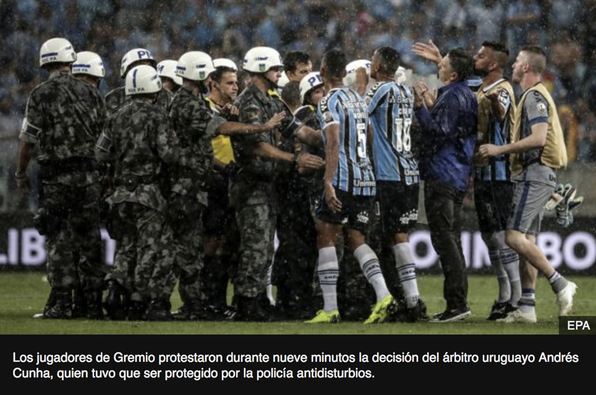Los jugadores de Gremio rodearon al colegiado tras confirmar la pena máxima protestando airadamente la decisión que terminaría por definir el pase del club argentino a la final.