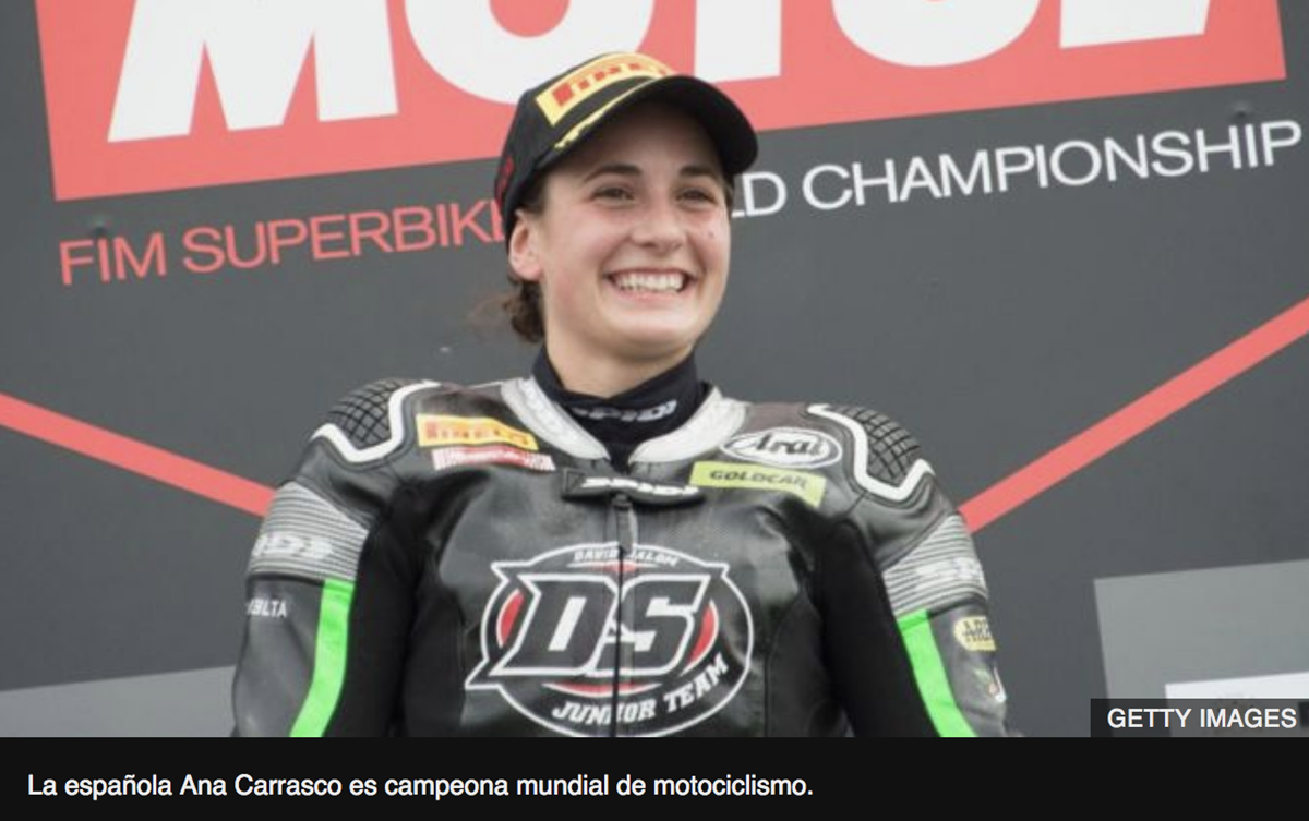 Carrasco, quien nació en una familia dedicada a los deportes a motor -su padre es mecánico de pilotos profesionales- y comenzó a montar motocicletas a los tres años, también fue el año pasado la primera mujer en subirse a lo más alto del podio en una prueba mundial al ganar en su debut en el Gran Premio de Portugal en septiembre.
