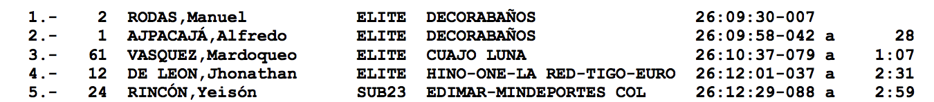 Para que un guatemalteco no gane la edición de este año tendrían que descontarle a Rodas al menos dos minutos y 59 segundos, que es el tiempo que le lleva al colombiano Yeisón Rincón, quien se ubica en el quinto puesto.
