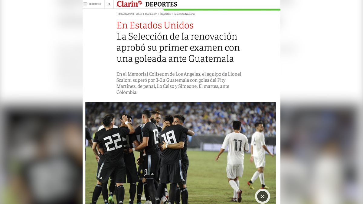 El Clarín escribió: “En Estados Unidos La Selección de la renovación aprobó su primer examen con una goleada ante Guatemala”