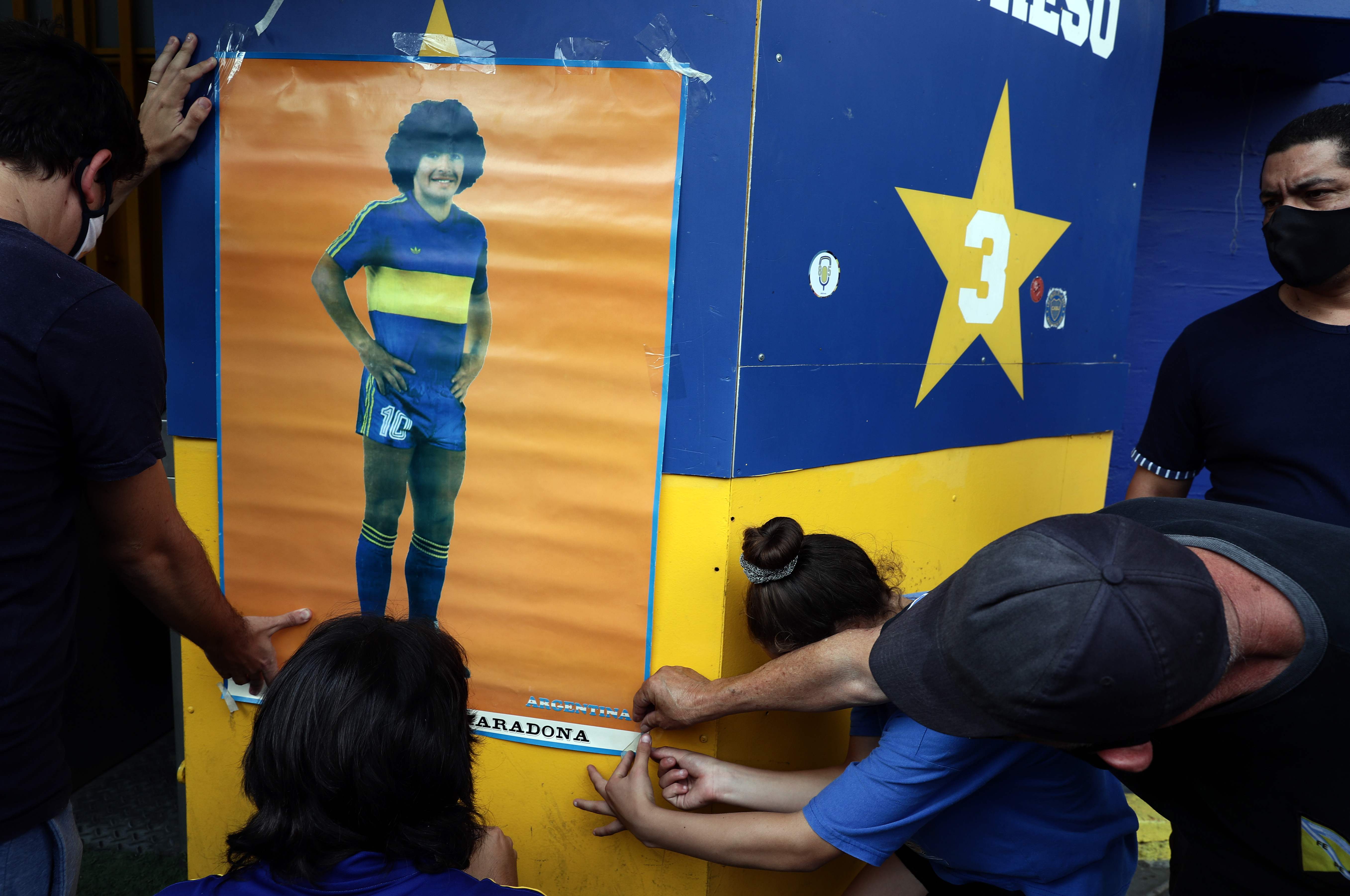 Las personas colgaron afiches de Diego Maradona afuera de La Bombonera, el estadio del Boca Juniors. Foto Prensa Libre: AFP.